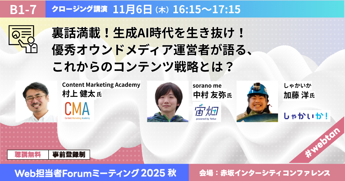 裏話満載!生成AI時代を生き抜け! 優秀オウンドメディア運営者が語る、これからのコンテンツ戦略とは? / 【11/6~7赤坂リアル開催】ダイソー、キリン、サンリオなど登壇! 最新トレンド満載、全50超講演