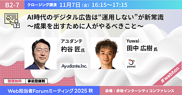日本のWeb担当者さんに「参考になる」「役に立つ」情報をお届けするセミナーイベント「Web担当者Forum ミーティング2025 秋」を11月6日(木)~7日(金)の2日間にわたり開催します。今年の会場は「赤坂インターシティコンファレンス」です。