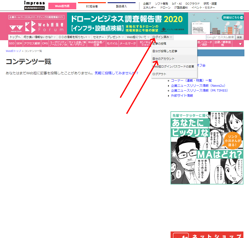 ページ上部、スーパーバナーの下にあるメニューの右端[ログイン済み]から[自分の投稿した記事]を選びます。