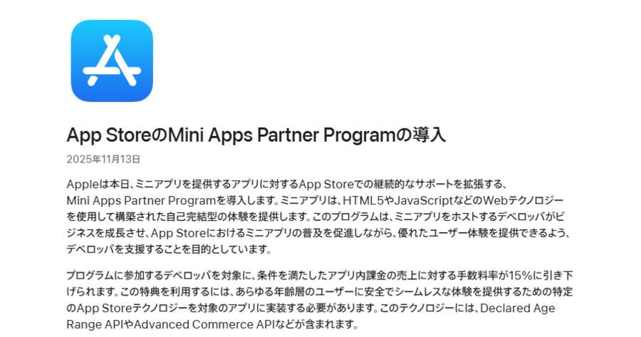 AppleがApp Store手数料率を半額15%でミニアプリ向け「Mini Apps Partner Program」 アプリ内課金の手数料率を30%から引き下げ、Web技術を活用する開発者を継続的に支援