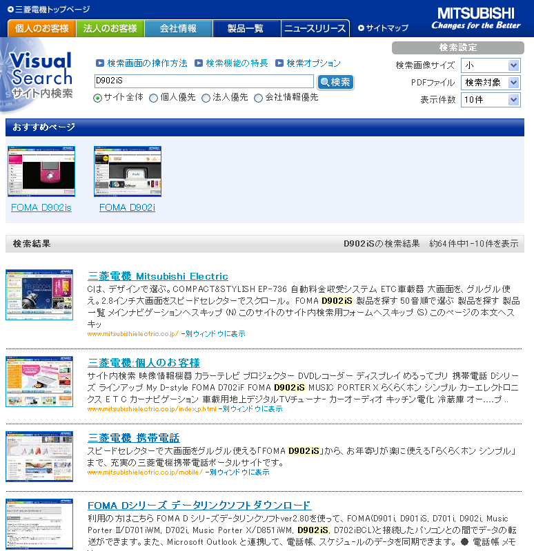 三菱電機のウェブサイトでは、サイト内検索として同社の検索エンジンをASPで利用しており、次のような機能を実現している。