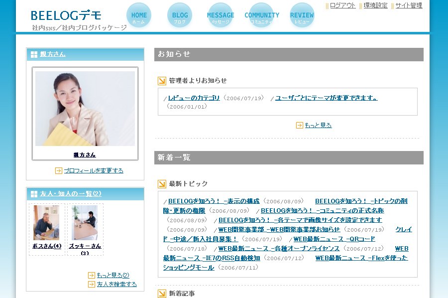 BEELOG(ビーログ)は、社内の情報共有を目的とした社内SNSや社内ブログ、コマースSNSなどの構築するためのパッケージソフトウェア。ASPサービスと違い、ユーザー自身でソースを改変してカスタマイズできるのが特徴だ。