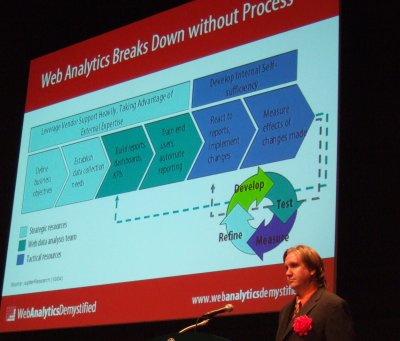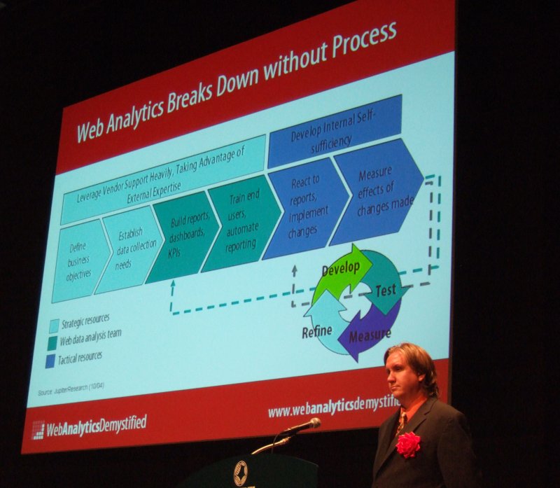 講演でエリック・ピーターソン氏は、Web解析を行う際には、単に分析を行うだけでなく、規定されたプロセスに従って運用することが必要だとした。「現在、世界の企業の中でも、Web解析への投資管理を規定されたプロセスを用いて行っている企業は8%ほどである。米国の企業では、規定されたビジネスプロセスをWeb解析に活用している企業のうち、50%がWeb解析に対する投資以上の収益を得ている」と語り、プロセスを用いてWeb解析を行うことの重要性を説いた。