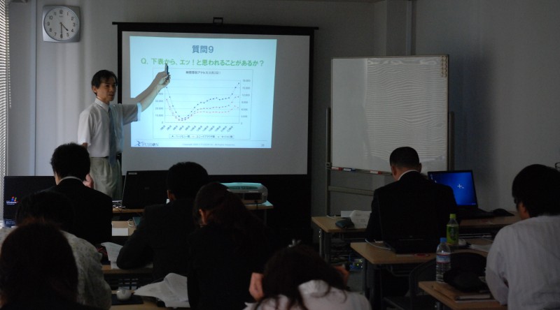後半の衣袋氏のセミナーでは、アクセス解析に役立つ基礎講座「数字力をこうしてアップする」として、日常扱うさまざまなデータのどこに気をつけるのか。一見すると何の変哲もないデータも、捉え方や報告のしかたで内容は変わってくるもので、講義ではアクセス解析でも陥る罠をサンプルデータを元に体験。実際にどこに気をつければいいのか、課題を投げかけられた参加者は頭をフル回転させながらデータと向き合っていた。
