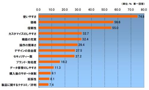 8割弱が「使いやすさ」を重視、次いで「価格」や「信頼性」