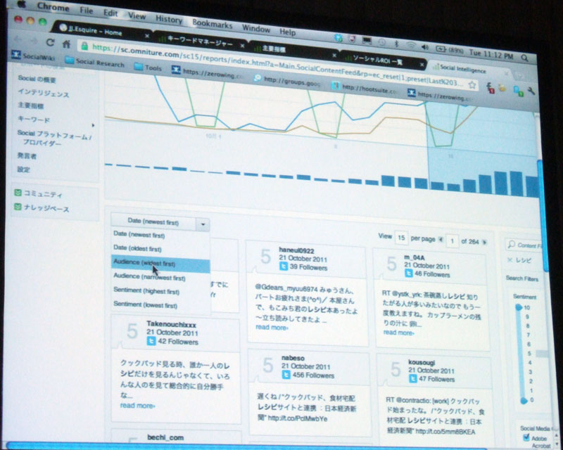 ソーシャルメディア上の声の測定は、企業のマーケッターが独自にキーワードを追加可能で、どのソーシャルネットワーク上でどういった消費者の声があるのか把握できる。キーワードの総数だけでなく、だれが発言しているのか、ブランドへの影響力がどのぐらいあるのかといった数値も同時に割り出す。Facebookであれば、Facebookページやファンに関する属性データ、「いいね!」ボタンのクリック数や共有などの要素を測定できる。Twitterでは、フォロワー数のデータはもちろん、Webサイトへの訪問者数やTwitterが他のチャネルにもたらす影響なども把握できる。実際のつぶやきを管理画面上で表示し、そこから返信するといった使い方も可能だ。
