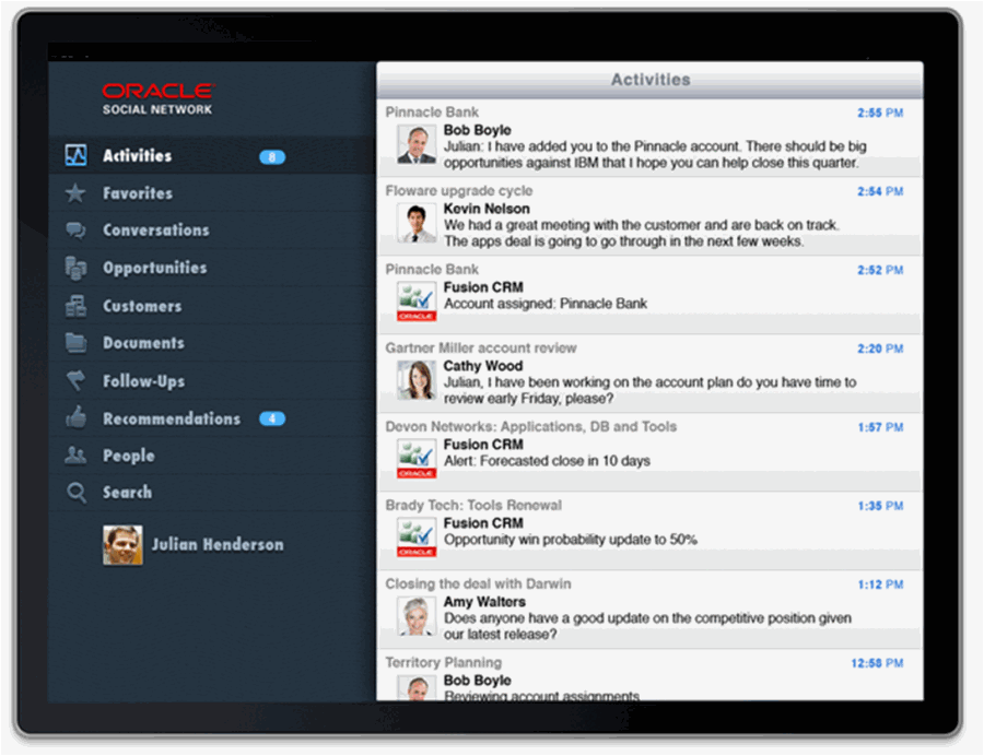 Oracle WebCenter Social(従業員向け) ―― 企業内コラボレーションやソーシャルコミュニケーション基盤。業務プロセスやアプリケーション内を流れる情報を把握し、チーム内で共有するためのソーシャルツールを提供する(外部のソーシャルメディア連携をするものではなく、内部コミュニケーション向け)。