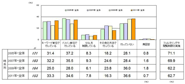 Webページの閲覧では、62.7%の企業が何らかの閲覧制限を行っており、企業規模が大きくなるほど厳しいという。具体的には、「ドメイン単位で実施」の34.6%、「キーワード単位で実施」の33.3%、「SSL(https://)の制限」の7.8%の順で多い。