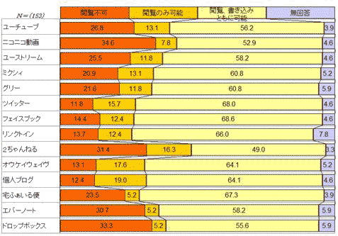 Webサービス別に閲覧不可能な割合を見ると、YouTubeが26.8%、Facebookが14.4%、Twitterが11.8%などであった。従業員5,000人以上の大企業においてはYouTubeが46%、Facebookが24%、Twitterが22%、それぞれ閲覧不可能だった。ソーシャルメディアの普及により、企業が企業内個人に向けてインターネットで情報発信するケースが増えるなか、その伝達方法については配慮する必要がある、としている。