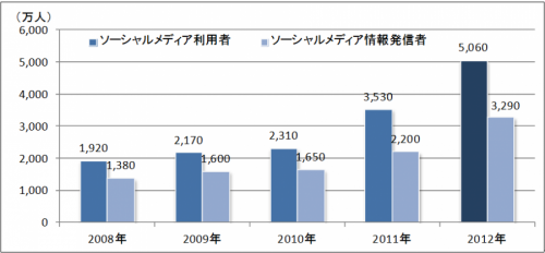調査から、日本のソーシャルメディア人口は前年比143%の5,060万人となり、昨年の3,530万人から1,530万人増加している。ここでいうソーシャルメディアとは、友人や知人等とのコミュニケーションや交流を促進する場や仕組み、具体的にはSNSおよびマイクロブログと定義されており(閲覧のみの利用も含む)、投稿や書き込みなど、何らかの情報発信を行っているユーザーは3,290万人と推計され、ソーシャルメディア利用者の65.0%に該当するという。