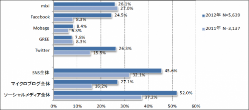 SNSの利用率は、mixiが26.1%(昨年は27.0%)、Facebookが24.5%(同8.3%)、Mobageが8.4%(同6.3%)、GREEが7.8%(同8.3%)となった。Facebookが躍進したことで、昨年32.1%のSNS利用率が45.6%に引き上げられたとしている。また、Twitterの利用率も昨年の15.5%から26.3%と大きく上昇し、その結果、SNSもしくはマイクロブログを利用しているソーシャルメディア利用者はインターネットユーザーの52.0%にあたり、2人に1人が利用しているという。