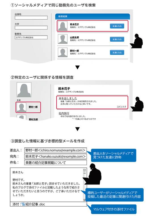 FacebookやTwitterといったソーシャルメディアの普及により、より多くの個人属性や言動情報を第三者が収集しやすくなるなど、標的型メール攻撃を行いやすい環境ができている。