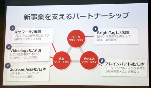 新たに開始するのは、「データソリューション」「ビジネスソリューション」「広告ソリューション」領域の事業で、各領域の企業5社との協業によって4つの新事業を開始する。これまでは広告を使って広告主の課題を解決してきたが、今後はデータ核に広告主の課題を解決していく。