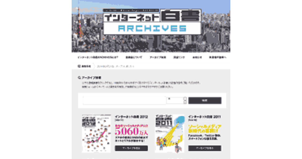 インターネット白書ARCHIVESでは、1996年から日本におけるインターネットの変化を発信してきた書籍年鑑『インターネット白書』の記事(PDF)を無料で閲覧できるWebサービス。公開されているのは、今年度版『インターネット白書2013-2014』を除いた1996年版から2012年版まで、号ごとの目次、または単語による全文検索で目的の記事を探し出せる。