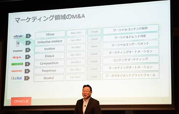 Oracle Marketing Cloudは、すでに展開していたソーシャルマーケティング管理の「Oracle Social Cloud」、マーケティングオートメーションの「Oracle Eloqua」と「Oracle Responsys」、これにDMPの「Oracle BlueKai」を加えて構成する。オラクルでは2年間のうちにマーケティング関連企業7社を買収しており、これらのソリューションを統合クラウドサービスとして提供し、「データベースでナンバーワンのオラクルが、マーケティングでもナンバーワンを目指す」(杉原CEO)という。