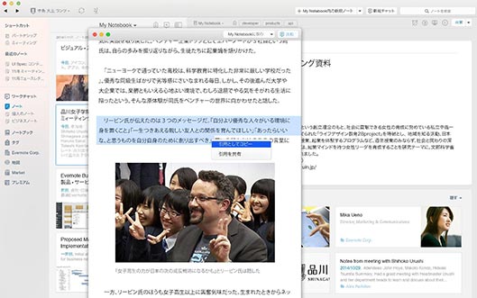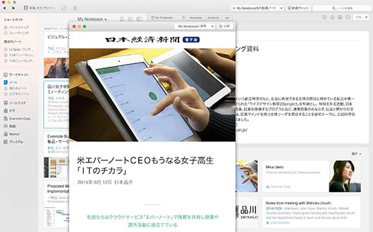 また、Evernoteと連携した日経電子版を読む際は、ユーザー本人が過去にEvernote内に作成・保存したノートやグループで共有したノートから、閲覧中の記事に関するものを自動的に電子版上に表示する機能も順次提供する予定だ。