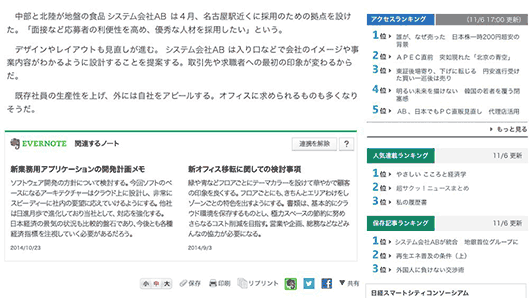 Evernoteに関連する記事を配信するサービスは、英語圏向けにすでに始まっているが、アメリカ以外では日経が第1号となる。加えて、ユーザーがEvernoteに保存したノートのうち、ニュースサイト上で閲覧しているニュースと関連が深いノートを表示するサービスは、日経電子版が世界で初となる。