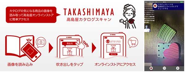 対象はチョコレートの「2015タカシマヤアムール・デュ・ショコラカタログ」で、店頭で配布中。アプリは「Android」2.3以降と「iOS」6.0以降に対応し、「Google Play」「iTunes App Store」で無料配信する。カタログの商品画像データがサーバーに登録され、アプリで認識・抽出した画像と瞬時に照合して表示する。GAZIRUは世界最高水準の精度の画像認識エンジンを持つ。高島屋は、各種の販売方法を融合したオムニチャネルの一環で導入した。