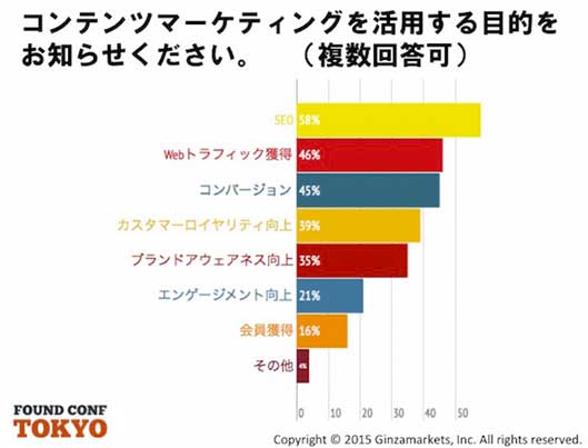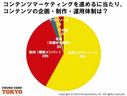 コンテンツマーケティング・SEO管理プラットフォーム開発のGinzamarketsは、日本国内のBtoC企業のコンテンツマーケティングの取り組み実態を調査した「コンテンツマーケティング調査レポート2015」を2月2日に発表した。調査対象は、1月に開催した「Found Conference in Tokyo」に参加したマーケッター。