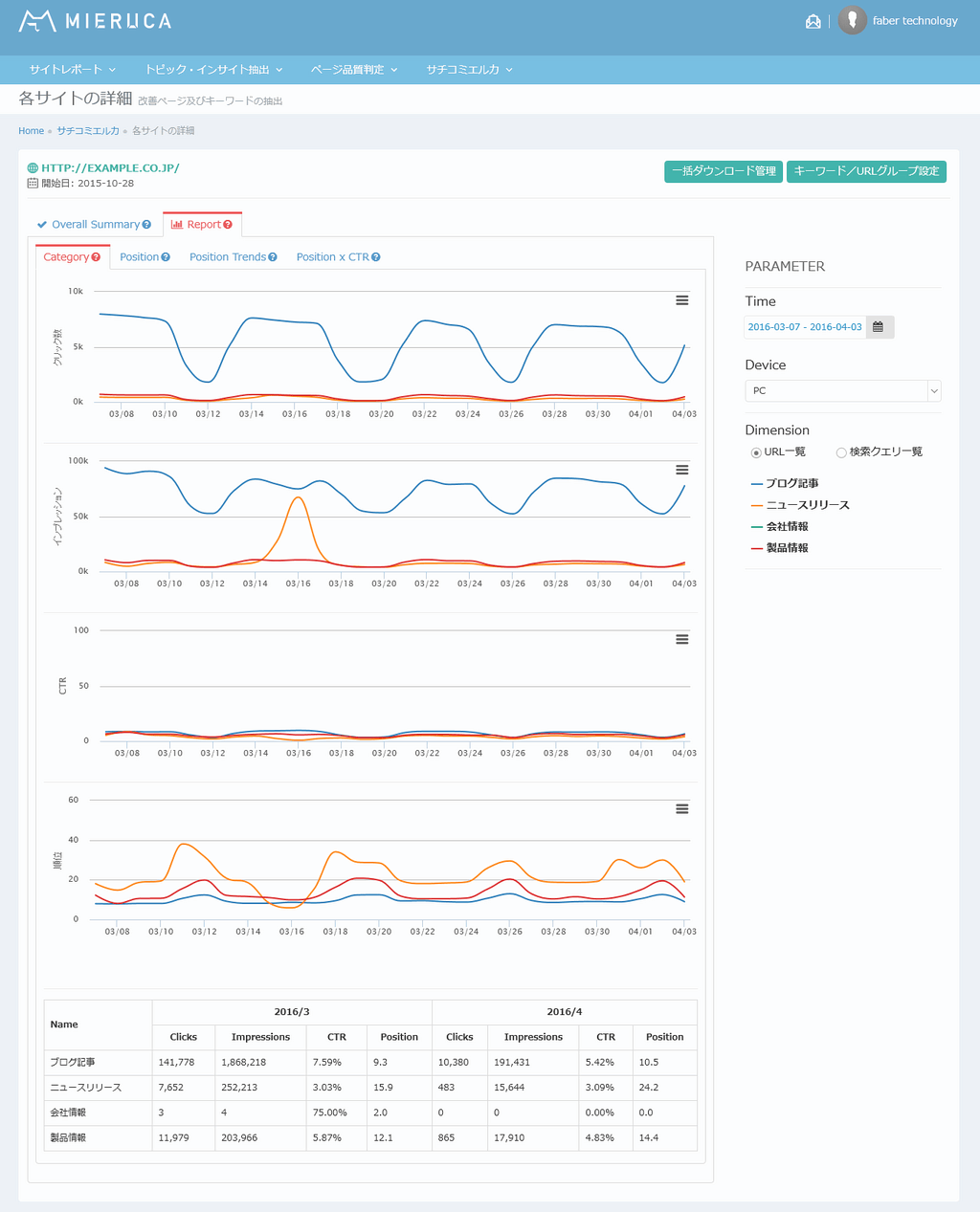Faber Technologyは、同社が提供するSEOツール「サチコミエルカ」に、キーワードやURLのグループでセグメント化してデータを表示する機能などを、4月6日に実装した。