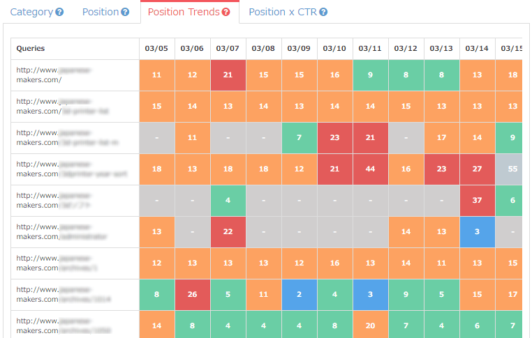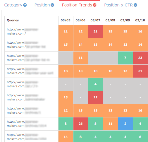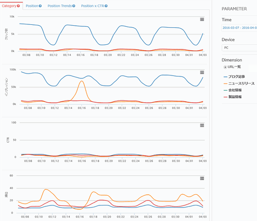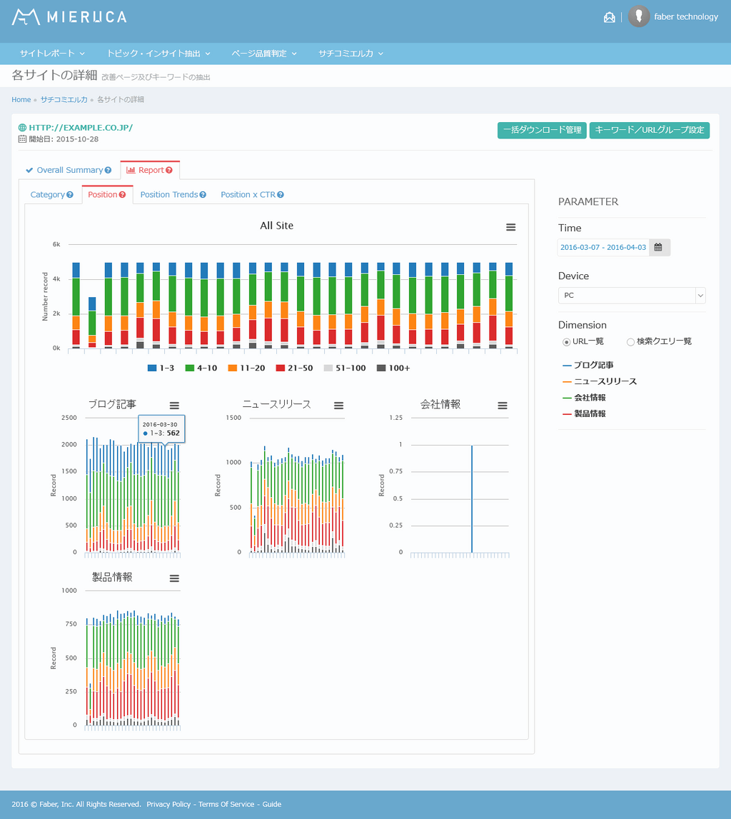 検索結果での表示順位の時系列での推移を、URLやキーワードごとに表示(グループによるフィルタリングが可能)。