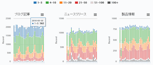 検索結果での表示順位を「1位~3位」「4位~10位」「11位~20位」「21位~50位」などでセグメント化した分散状況の確認を、URLやキーワードのグループごとに表示。