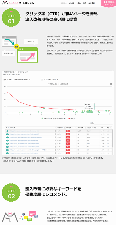 「サチコミエルカ」は、グーグルがサーチコンソールで提供する検索アナリティクスのデータを蓄積して分析することで、コンテンツマーケティングなどにおけるSEOの改善をサポートするサービス。