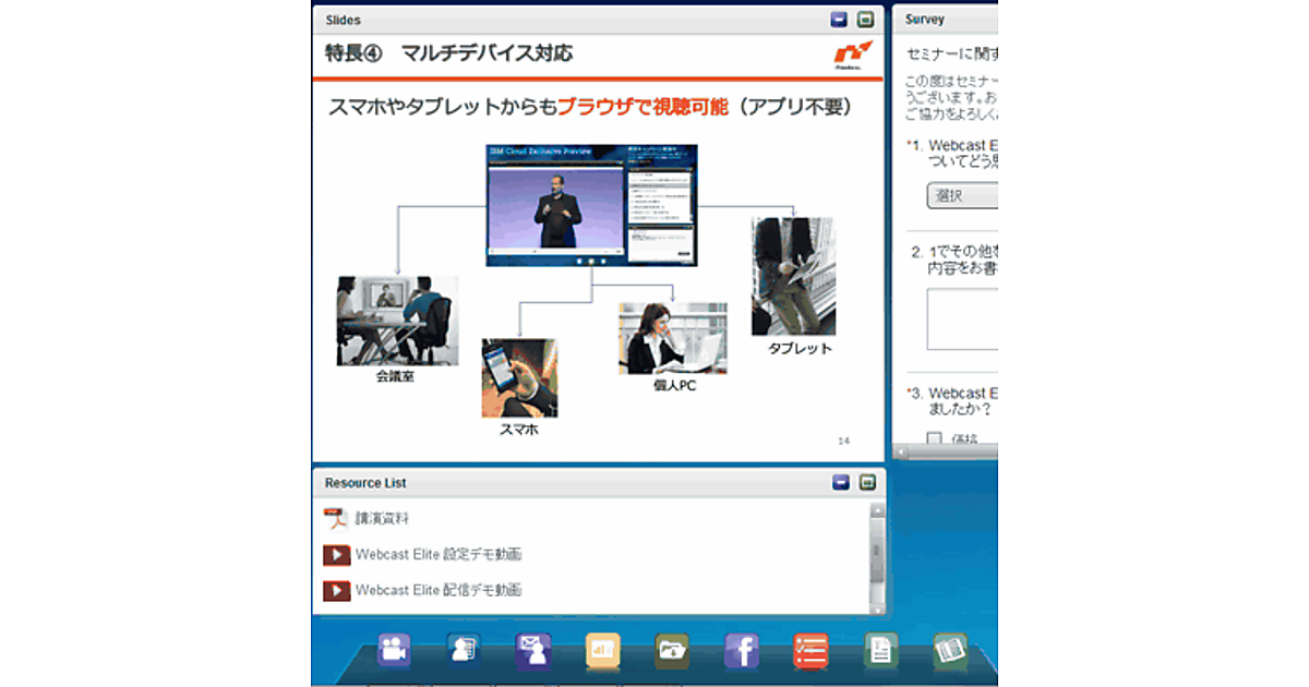 Webcast Eliteは、アイティメディアが提供するバーチャルイベントサービスの1つで、配信者自身が告知から配信まで簡単に行えるセルフ型のサービス。パソコンやタブレット、スマートフォンなどのマルチデバイスに対応し、リアルタイムのQ&A機能やアンケート機能、オンラインレポート機能などを備える。