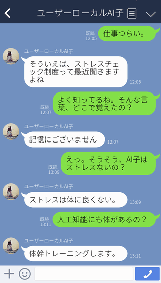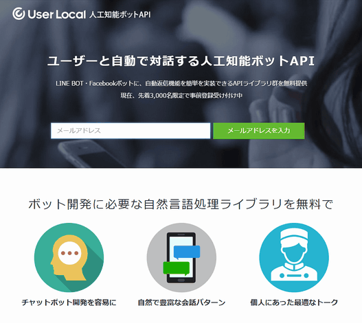 LINEやFacebookでユーザーとやりとりする「チャットボット」を作成できる人工知能会話プラットフォーム「人工知能ボットAPI」を、ユーザーローカルが5月10日に発表した。
