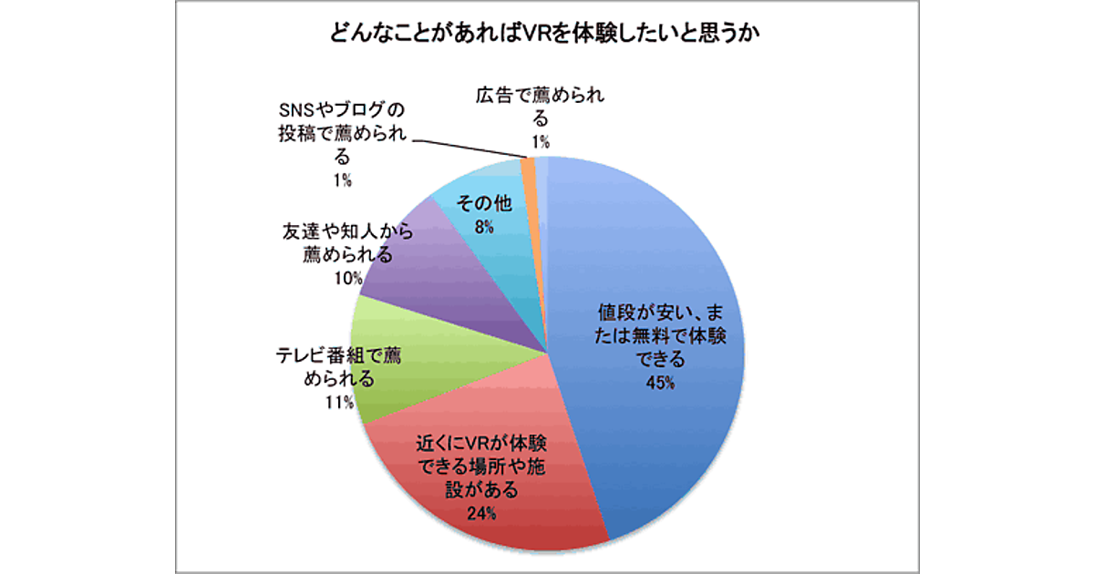 また、どんなことがあればVRを体験してみたいかについては、「値段が安い、または無料で体験できる」が45%、「近くにVRが体験できる場所や施設がある」が24%で合わせて79%となり、多くの人が体験するきっかけを求めていることが読み取れる。