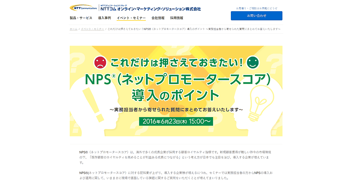 マーケティング支援のNTTコム オンライン・マーケティング・ソリューションは、NPS(ネットプロモータースコア)導入のポイントを解説するセミナーを6月23日(木)に東京・品川区で開催する。