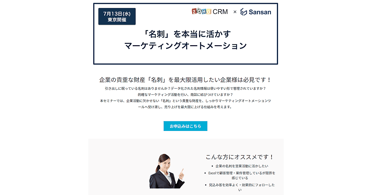 「『名刺』を本当に活かす マーケティングオートメーション」と題したセミナーを、ソフトウェア開発のゾーホージャパンと、名刺管理サービスのSansanが東京・渋谷区で7月13日(水)に開催する。