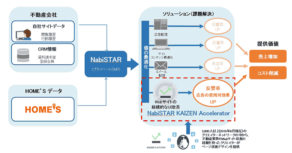 ネクストは、不動産会社の自社データと不動産情報サイト「HOME'S」のデータをかけ合わせて分析するDMP「NabiSTAR Report(ナビスターレポート)」を昨年から提供していた。今回のサービスは、同DMPの活用とKaizen Platformが持つWebサイト改善のノウハウを連携したもの。