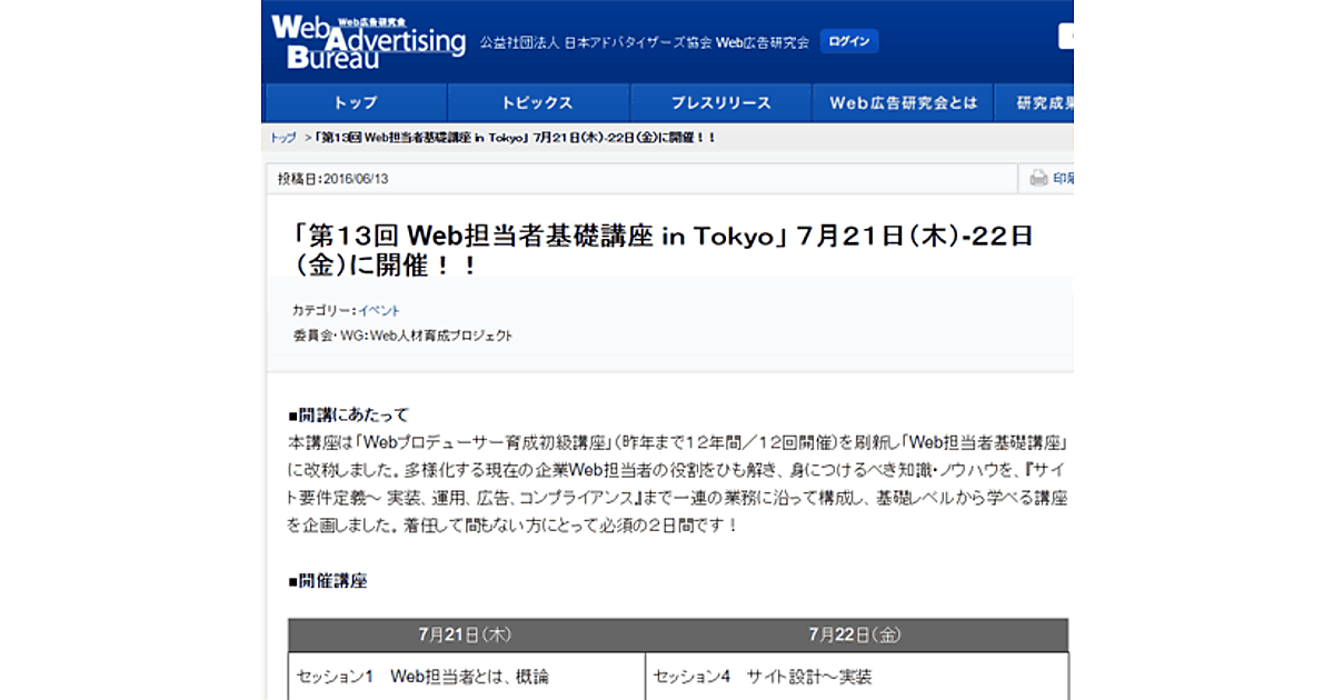 日本アドバタイザーズ協会 Web広告研究会は、企業Web担当者の身につけるべき知識・ノウハウを学ぶ講座「Web担当者育成基礎講座in Tokyo」を7月21日(木)と22日(金)の2日間、東京・銀座で開催する。