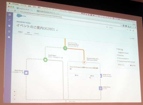 Engagement Studioは、Pardot上でのマーケティングシナリオの設計や分析をサポートする新機能。BtoB企業のマーケティングチームのコマンドセンターとして機能し、1つの画面上でシナリオ設計、実行、効果測定、検証まで一括管理できるようになる。これまでも、Pardot上で同様の設定はできたが、ビジュアル化された1つの画面で簡単に管理できることが特徴。