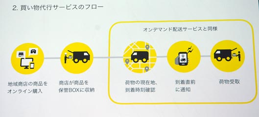 主な利用者として、小さな子供を持つ家庭や高齢者を想定したサービス。地域の複数商店の商品をインターネット上で購入し、オンデマンド配送サービスで一括配送する。