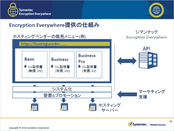 Encryption Everywhereは、シマンテックが提供するSSLサーバ証明書の発行や企業認証などのセキュリティサービスをホスティング事業者が提供可能にするためのサービス。