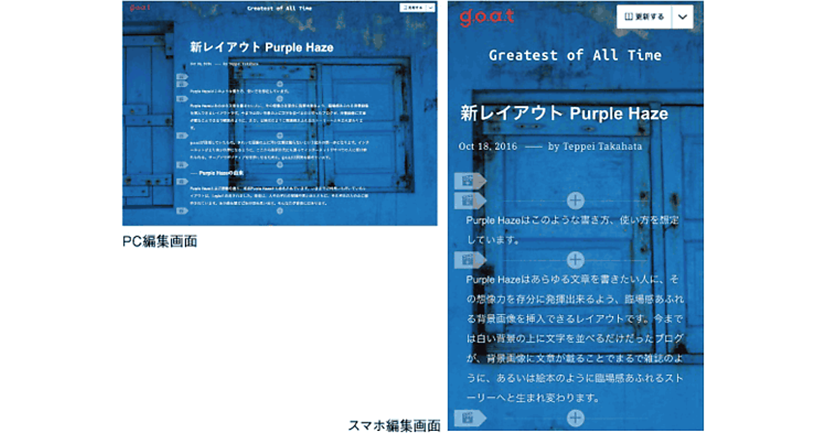 今回追加された「Purple Haze」は、全画面画像の上に文字を重ねて表示するレイアウトで、雑誌のようなブログを簡単に作成できる。ページをスクロールすると、スムーズにクロスフェードで画像が切り替わり、従来のブログにはない新しい表現を楽しめる。