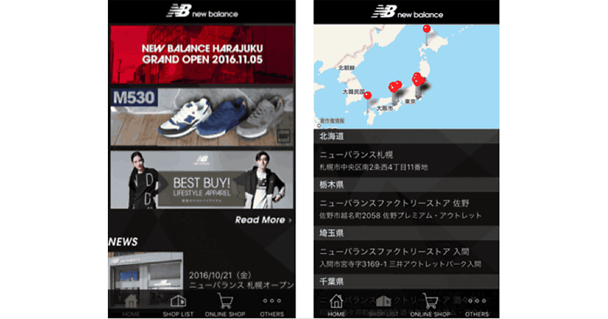 今回リリースした公式アプリでは、ニューバランスが運営する直営店・ファクトリーストア・公式オンラインショップの情報を配信。アプリを利用すると、GPSを使って現在地から近い店舗を距離別に探したり、アプリからECサイトで直接商品を購入したりできる。