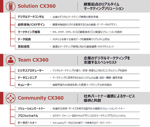 CX360は、デジタルマーケティングに関わる技術やノウハウを集約。組織を横断し、顧客1人ひとりに対して最適なマーケティングアプローチを可能とする製品・ソリューション群を、次の3つの枠組みで構成した。