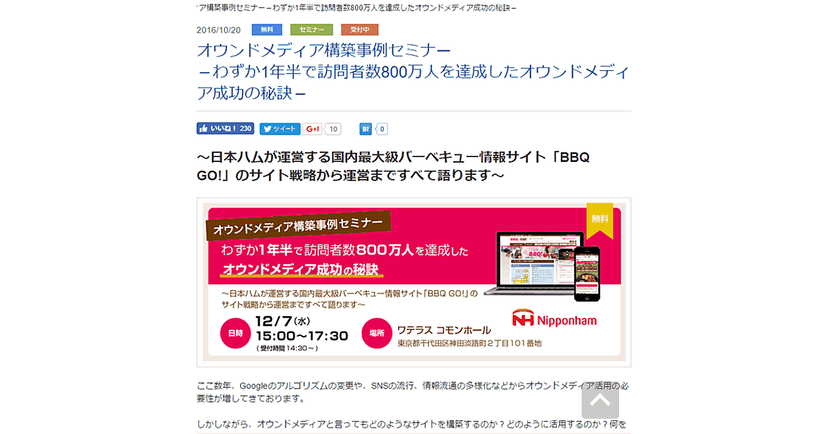 - セミナー名: わずか1年半で訪問者数800万人を達成したオウンドメディア成功の秘訣