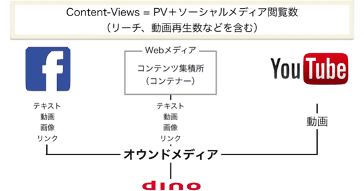従来は、WebメディアのページビューとFacebookページのリーチ(またはインプレッション)、YouTubeの動画再生回数はそれぞれ切り離されて計測されていた。「dinoインサイト」を利用すれば、「コンテンツがどれだけのオーディエンスに見られたか」という総数を「コンテンツビュー」という新しい指標として計測可能になる。