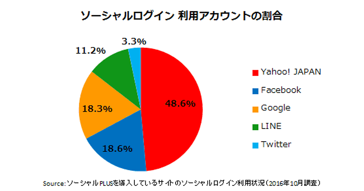 調査の結果、日本国内ではソーシャルログインにYahoo! JAPANのアカウントを利用する割合が48.6%でトップとなり、続いてFacebookが18.6%、Googleが18.3%、LINEが11.2%、Twitterが3.3%だった。