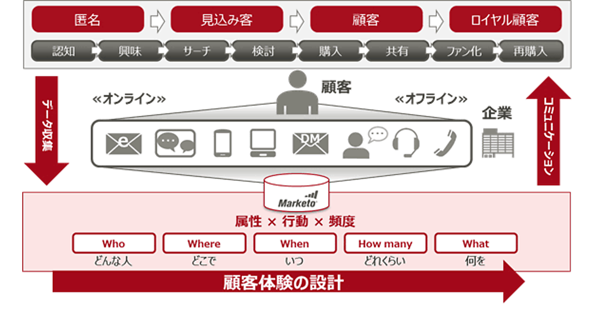 「CX360」のビジネスマネジメントプラットフォームでの分析結果を、「Marketo」に自動連携させる仕組みを構築する。これにより、顧客行動パターンに基づく顧客のセグメンテーション情報を複数のデータソースをもとに生成し、「Marketo」で利用できる。