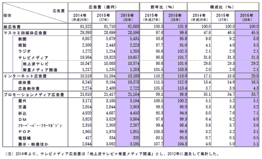 電通は2月23日、2016年1月~12月の日本の総広告費を推定した「2016年 日本の広告費」を発表した。日本の総広告費は6兆2,880億円(前年比101.9%)となり、5年連続で前年実績を上回った。