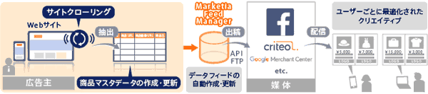 従来は、データフィードは広告主から商品マスタデータの提供を受けて生成していたが、サイトクローリング機能の実装によって、クローラーが自動的に広告主のWebサイトを巡回してデータを抽出し、データフィードを生成・更新できるようになる(サイト上に必要データがない場合を除く)。これによって、ダイナミック広告配信にかかる広告主の工数・コストを削減しながら、鮮度と精度の高い情報をもとにした媒体ごとのデータフィード最適化を実現する。