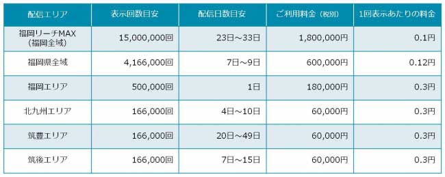 広告料金は、広告の表示回数に応じたインプレッション型。初期費用・運用費・設定手数料はかからず、配信地域に応じてインプレッション単価0.1円から(最低利用金額6万円)利用できる。