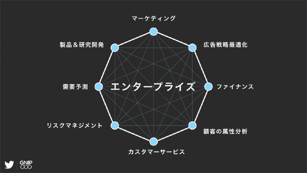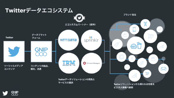Twitterは、リアルタイムに生まれる膨大な量のツイートをTwitterのデータビジネスを担うGnipチームが蓄積・加工し、世界中のデータパートナーを通して提供している。日本では2015年からデータビジネスを本格化、国内のデータライセンスのパートナーは数十社あり、データを提供するだけではなく、分析・ビジュアライズ・コンサルティングなどの付加価値とあわせて提供する。