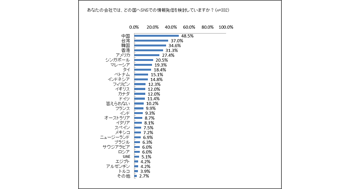 SNSで情報発信を検討している国の1位は中国の48.5%となり、次いで、台湾(37.0%)、韓国(34.6%)という結果に。