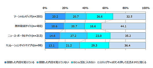 ※実際の設問においては、“ソーシャルメディア=ソーシャルメディアのタイムライン上に表示される動画広告”、“無料動画サイト=無料動画サイトの動画コンテンツの前や途中に表示される動画広告”、“ニュース・ポータルサイト=テキスト情報で構成されるニュース・ポータルサイトに表示される動画広告”、“キュレーションサイトやアプリ=キュレーションサイトやアプリに表示される動画広告”と表示。